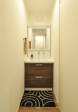 お風呂と構造上必要な壁の兼ね合いで、脱衣室とダイニングとの間に洗面コーナーを配置。洗面化粧台はTOTO/サクア(W=750)をチョイス。脱衣室とつながる位置に衣類やタオル等が置ける収納を造作しています。