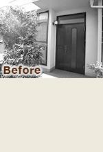 外壁塗装を施し新築のような仕上がりのファサード。玄関ドアは片開きにし、照明やポストの配置を一列に並べることで、エントランスをまとめています。