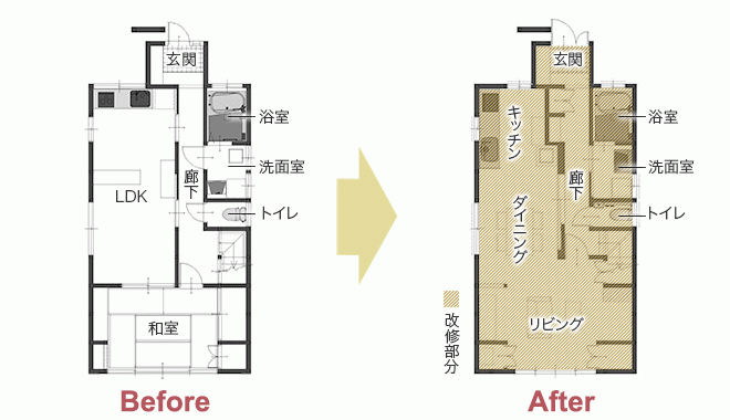 | リフォーム箇所 | リビング、ダイニング、キッチン、お風呂、トイレ、洗面室、玄関、外壁、屋根 |