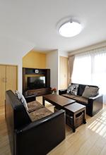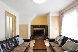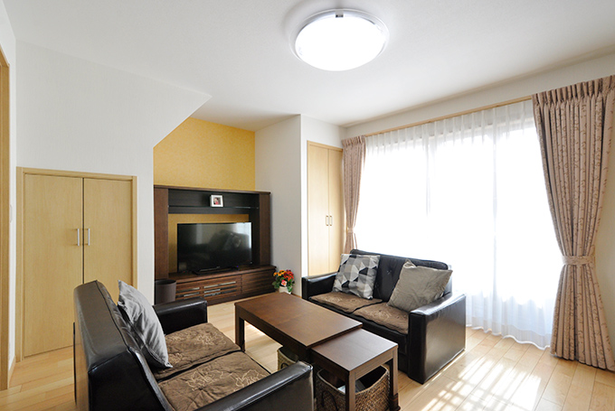 一番明るい南側の和室とLDKをつないで、構造上必要な筋交いはあわらしにして、ひとつの大きな空間に。テレビボード背面の壁は奥様の好きなオレンジ色のクロスでアクセント。窓ガラスはすべてペアガラスに取替え、床暖房も設置して温かく快適なLDKに。