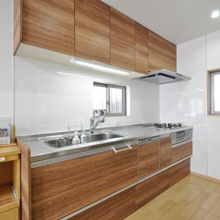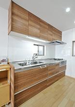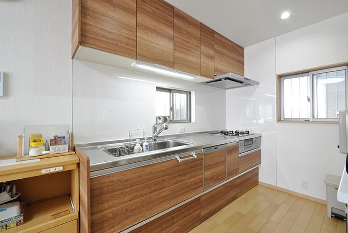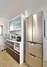 キッチンは西面に向きを変えてクリナップ/ラクエラ(W=2550)を設置。背面は収納と冷蔵庫がレイアウトできます。カフェウッドブレンドの扉カラーで温かみのある空間に。