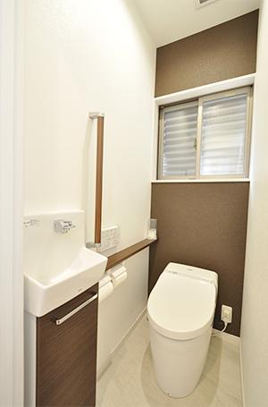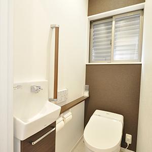 トイレはタンクレストイレ(TOTO/ネオレストDH1)に交換。背面にダークブラウンのアクセントクロスを貼って、他の空間とイメージを統一しています。