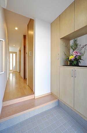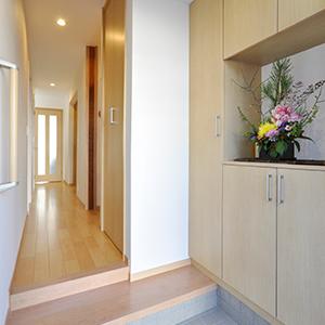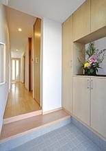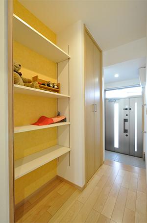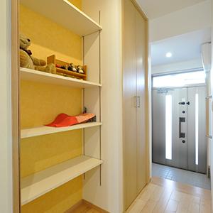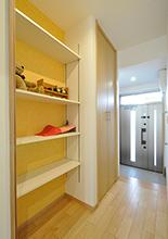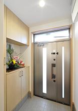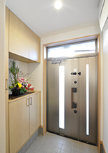 玄関ドアはオーソドックスなデザインで人気の三協アルミ/プロディに取替え。玄関収納も取替えて収納力UP!