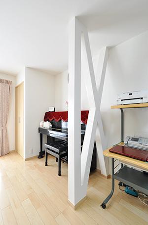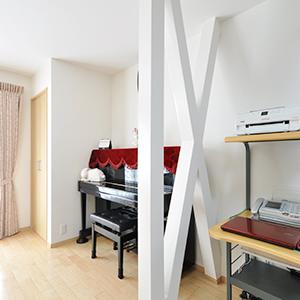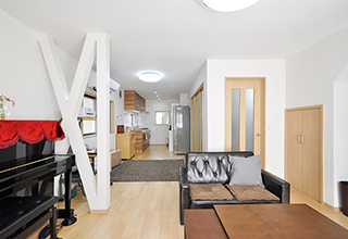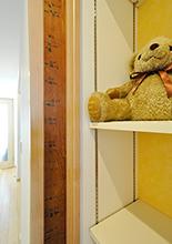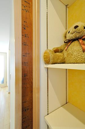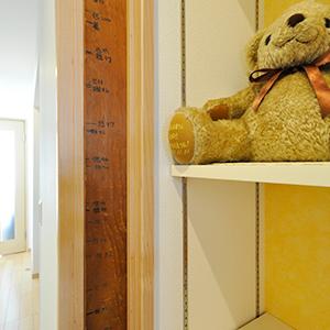 廊下にはコートなどの洋服がかけられるクローゼットと、可動棚で高さが調整できる収納を造作。家族の「思い出柱」を一部あらわしに。お子様の身長記録からは、家族が歩んできた歴史が伺えます。