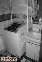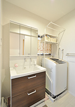 スペースの広さはそのままで、洗面と洗濯機のレイアウトを変更。化粧台はTOTO/サクア(W=750)にして、横の壁には水や汚れに強いパネルを設置しています。