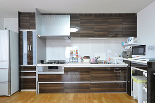 約18帖の洋室を子世帯のLDKにリフォーム。キッチンはLDKが広く使えるよう壁付け型に。グラッセウッドダークの扉色がアクセントのシステムキッチン(W2550)&カップボードは、クリナップ/ラクエラで統一しています。