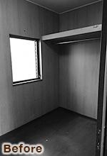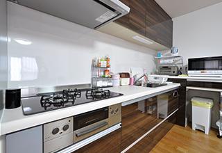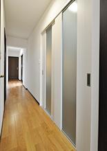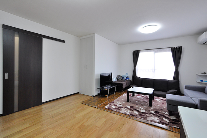 子世帯のLDKは約18帖あった西側の洋室に、壁付け型のキッチンを設置し、アレコレと片付けられる可動棚収納も造作。浴室と洗面室は、以前クローゼットだった約4.5帖のスペースに新設しました。親世帯と共有で使う階段と廊下の間には、引き戸を入れることでお互いのプライバシーが確保できるようにしています。