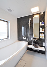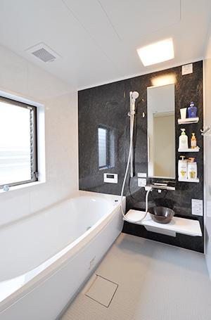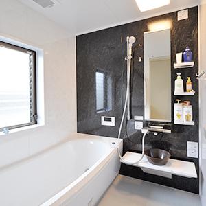 以前、クローゼットだった場所を浴室と洗面脱衣室に。お風呂はTOTO/サザナ(Tタイプ、1616サイズ)を選択。アースブラックのアクセントパネルが空間をキリリと引き締め、かっこいい浴室が誕生。