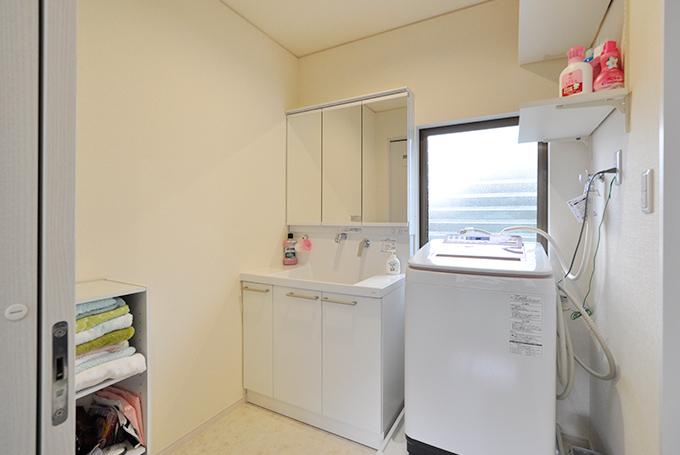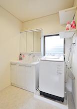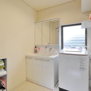 洗面化粧台はTOTO/オクターブを設置。幅が90cmでゆったりと心地よく使用できます。洗濯機上には可動棚を新設。洗剤など小物置き場に便利です。
