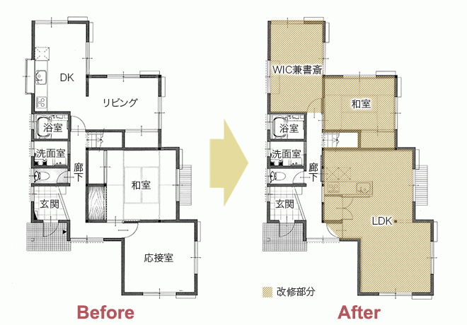 以前のお住まいは北側にLDKがあり、日当たりが悪く、冬の寒さが気になっていたK様。日当たりの良い南側にある応接室と和室は、ほとんど使用されておらず物置となっていたため、双方の場所を入れ替える間取り変更のリフォームをしました。