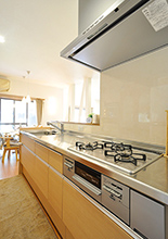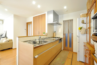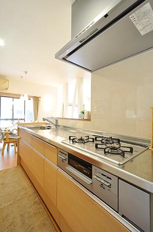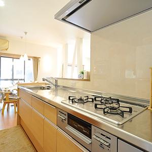 キッチンは和室だった場所に移設し、コミニュケーションが取りやすい対面式に。ダブルサポートシンクやアシストポケットなど使い勝手の良さで人気のシステムキッチン(LIXIL/アレスタW2400)に、背面収納はお手持ちの家具を配し、廊下へと抜けられる引き戸も設置しています。