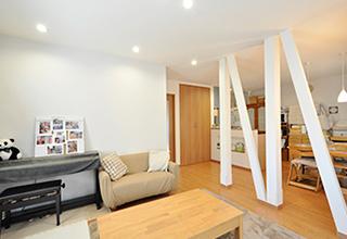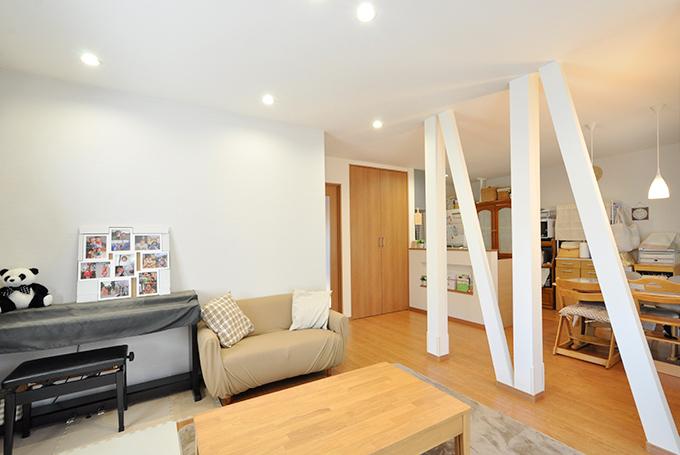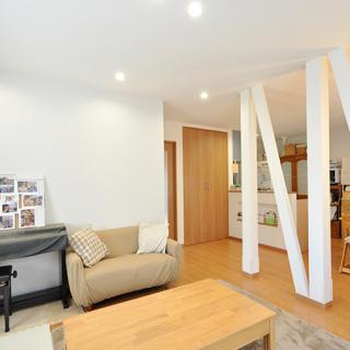 日当たりの良い南側にある応接室と和室をつなげてLDKに。構造用の筋交いは白いクロスを貼り、空間に馴染ませています。キッチン・ダイニング・リビングと、どこにいても家族と会話ができるようになりました。