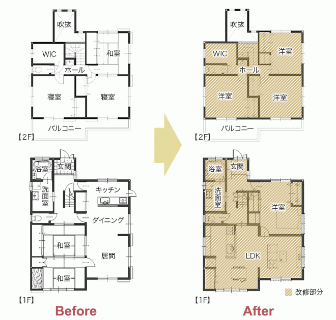 | リフォーム箇所 | 1F(リビング、ダイニング、キッチン、浴室、洗面室、トイレ、玄関、洋室)、2F(洋室、子供部屋、トイレ、洗面) |
