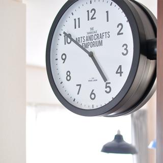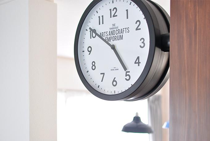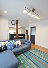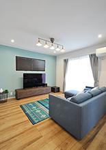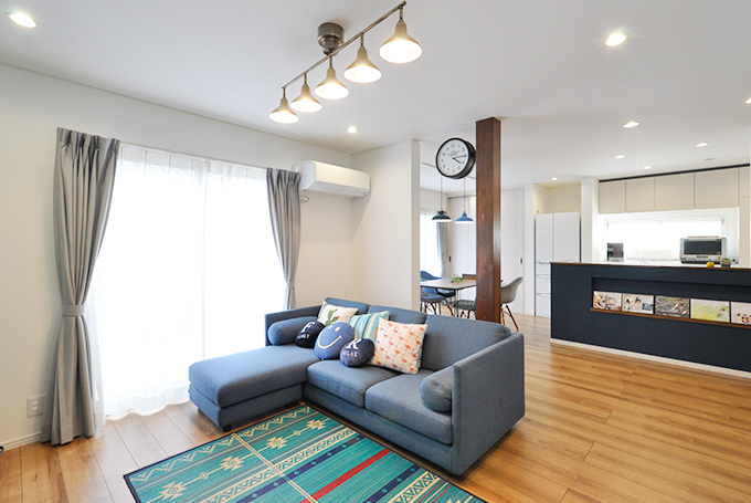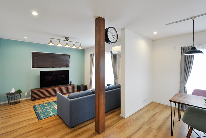 以前と位置は変わらないものの、ダイニングキッチンが北側から南側に移動したことで、収納スペースも増えたリビング。優しいペールターコイズブルーのアクセントクロスに、こげ茶色のテレビボードとウッドブラインドのコーディネートでカリフォルニア風のスタイルに。ヴィンテージ感のあるネイビーブルーのドア(LIXIL/VINTIA)に、柱はこげ茶色に塗装し、こだわりの両面時計をつけています。