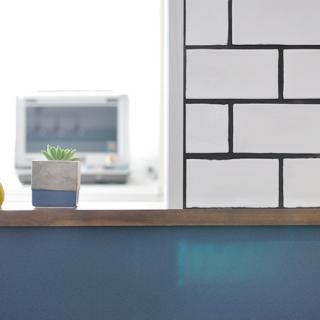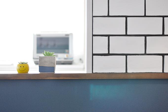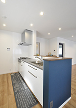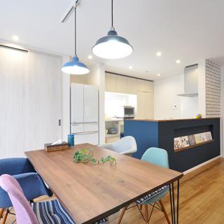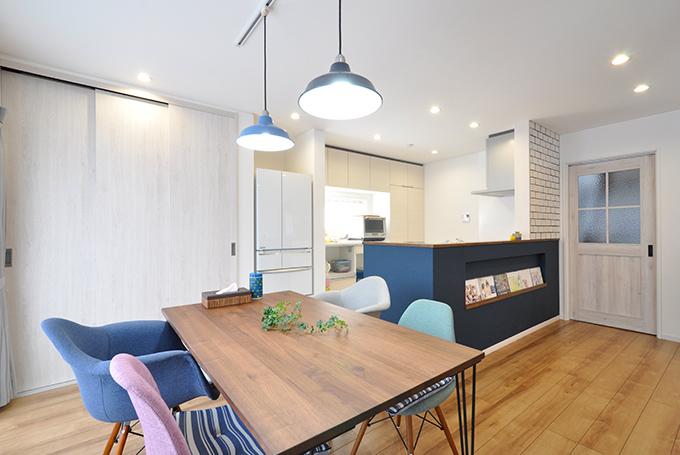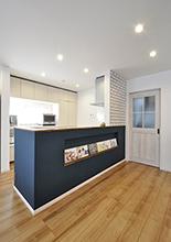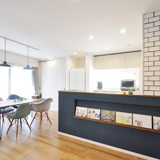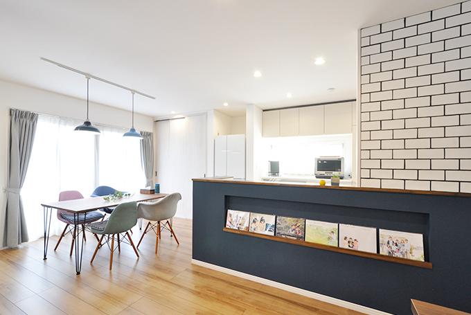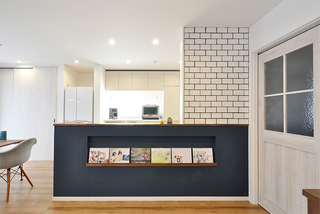 腰壁はネイビーブルーのクロスに、ご家族のアルバムを飾るマガジンラックを造作。コンロ前の壁には素朴感のあるサブウェイタイルをあえて黒目地で引き締めてカッコよく。