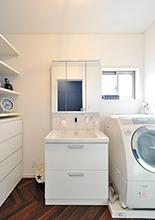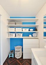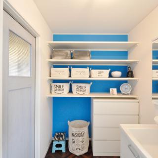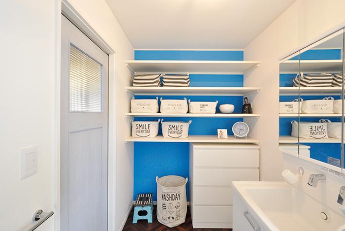 洗面化粧台や奥様セレクトの収納小物、オープン収納などホワイトを基調とした空間に、鮮やかなブルーが映え、西海岸インテリアを思わせる洗練された洗面脱衣室。化粧台は機能重視のTOTO/サクア(W750)。