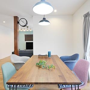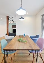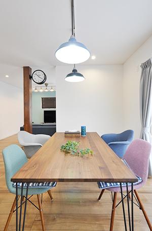 日当たりのよい南側にダイニングを移設。床の間だった場所はパントリーに。マリン系のカラーで合わせたペンダントライトやチェアが、開放的なリゾート感をでグッと引き立ててくれます。