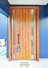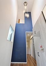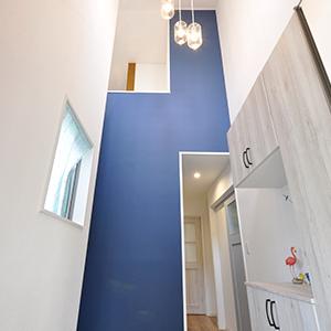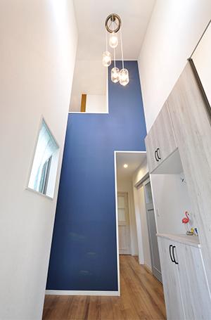 吹き抜けの高さが際立つ玄関ホール。正面の壁はネイビーブルーのクロスで印象度をアップ。玄関収納はLIXIL/パレットシリーズに取替え、ホワイトオーク扉にして建具と統一。玄関ドアは天然木の趣を感じさせる美しい木目調のチェリー柄(LIXIL/リシェント)を取り付けています。