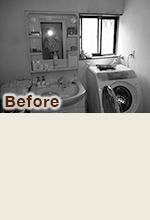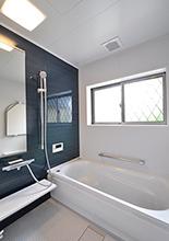 浴室もブルー系にこだわり、正面のパネルは藍色をモチーフとした「セイラン」を選択。ユニットバス(TOTO/サザナ、1616サイズ)なので、タイル貼りだった在来風呂に比べ、清掃性が断然良くなりました。