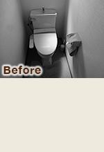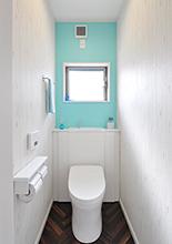 ホワイトオークの壁紙に背面だけ鮮やかなターコイズブルーを選んでアクセント。こげ茶のヘリンボーン柄の床材でカッコよく引き締めています。トイレは収納つき便器のTOTO/レストパルI型。