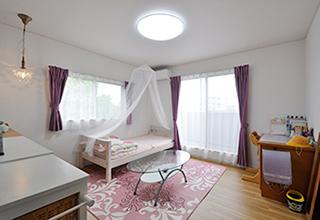 長女のお部屋はパープル×ピンクのコーディネートに、天蓋やスワロフスキーのペンダントライトをつけ女の子らしいお部屋に。クローゼット内部のクロスを濃い目のパープルにしたり、壁一面を植物柄のクロスにしてアクセントに。