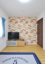 長男のお部屋はヘリンボーンの羽目板風のクロスで粗野感を出しつつ、カーテンやラグをブルー系で揃えて男の子らしいお部屋に。
