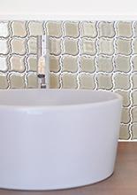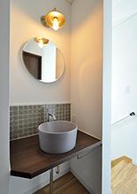 廊下の一角にお手洗いコーナーを造作。マットパープルのシンプルな洗面ボウル(サンワカンパニー)に、グレー1色のコラベルタイル(名古屋モザイク)を組み合わせています。