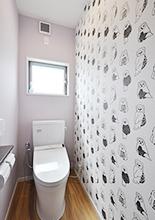 廊下にある手洗いボウルに合わせて淡いパープルのクロスと、フクロウのイラストが描かれたクロスを組み合わせて遊び心のある内装に。便器はTOTO/ピュアレストQRを設置。
