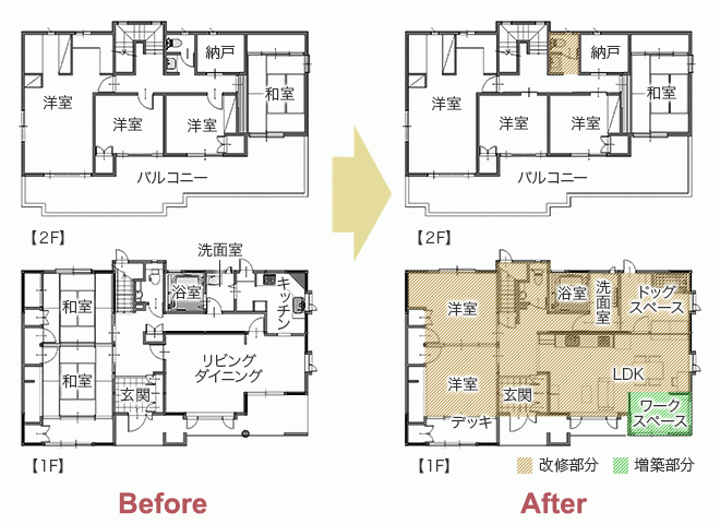 | リフォーム箇所 | 1F(リビング、ダイニング、キッチン、浴室、洗面室、トイレ、玄関、洋室、ドッグスペース)、2F(トイレ、洗面)、増築(ワークスペース) |