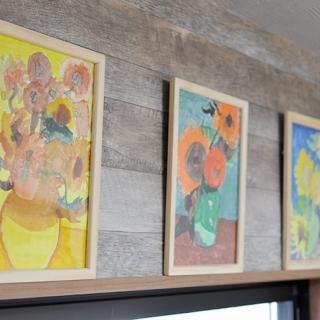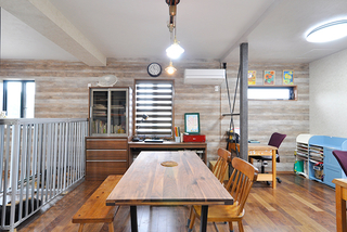 東側の壁面に木目調のクロスを横貼りして、山小屋のような雰囲気のあるダイニングに。
