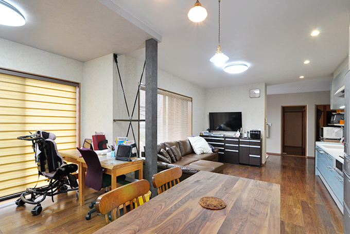 位置は変えず、廊下との間の壁や扉は取り払って、広く使えるようにしたリビング。床材は節を残した木目が特徴のイクタ/銘木フロアーST(ウォールナット)です。