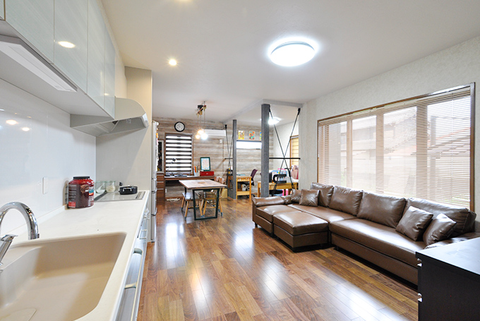 今回のリノベーションでは愛犬(シェパード)3匹のためのドッグスペースと専用シャワールームの新設。子供たちの勉強スペースをつくるための増築と、設備機器の取替えだけでなく、ライフスタイルに合わせて間取りも変更。DIY好きの奥様のセンスを活かしたクールでカッコいい内装も注目です。