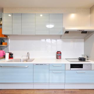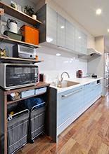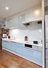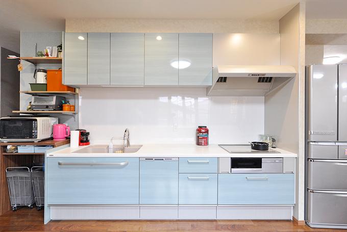 独立していたキッチンは、リビングダイニング側に移動し、ゆったりとお料理ができるよう壁付けタイプを選択。システムキッチンはトクラス/Bbシリーズ(W2850)。吊戸棚は一部昇降式タイプなので、食器の出し入れが簡単です。