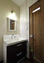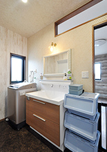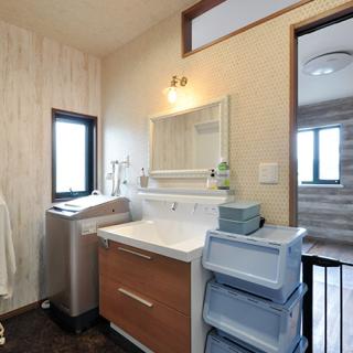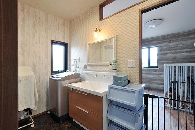 南北に空間を広げたことで、ゆとりが生まれた洗面室。化粧台はLIXIL/LCフルスライド(W900)。ドッグスペース側の入口上部には開口をつくり、空気がこもらないようにしています。