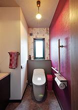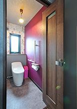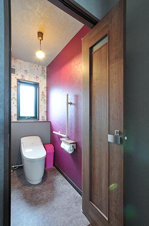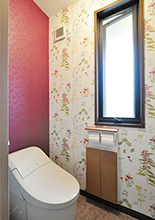 パープル×花柄のクロスで上品な印象に変わったトイレ。便器はLIXIL/プレアスLSリトイレを設置。扉は開閉スペースがコンパクトに収まるパナソニックの折れ戸ドアにしています。