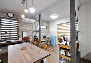 2階のバルコニー下の空間を増築し、お子様3人の勉強机を並べてスタディーコーナーに。筋交いは表しにしてLDKとつながりをもたせています。