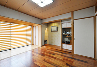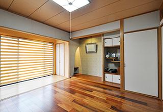 床の間や押入など和の要素を残しつつ、畳からフローリングに張り替え。床材は深い紫色から赤色、黄褐色と多彩な色あいと変化に富んだ木目が特徴のイクタ/銘木フロアーST(カリン)です。