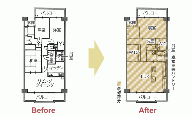 | リフォーム箇所 | リビング、ダイニング、キッチン、浴室、洗面室、トイレ、玄関、寝室、ウォークインクローゼット |