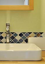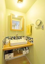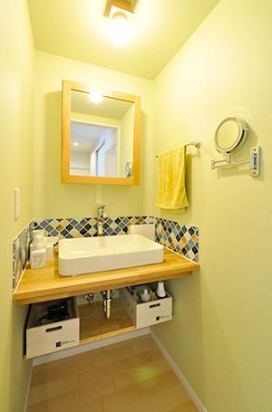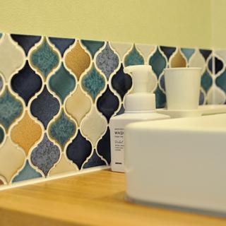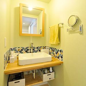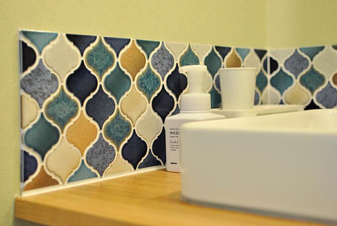 ウッドワンのミラー収納・カウンター・洗面ボウルに、名古屋モザイクのコラベルタイルを組み合わせておしゃれな洗面を造作。廊下に面しているので、お出かけの際はすぐに身なりをチェックでき便利です。