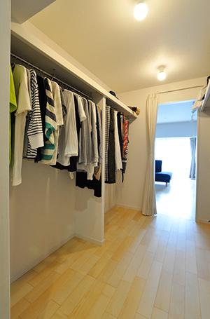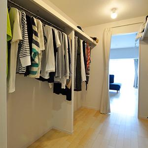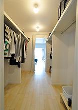 玄関からとリビングから。どちらからでもアクセスできるウォークスルークローゼット。掃除機や季節の物など洋服以外も入るたっぷり収納。来客の際は引き戸を閉めれば、サッと中身を隠せられます。