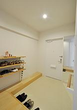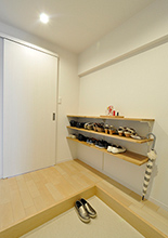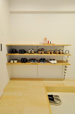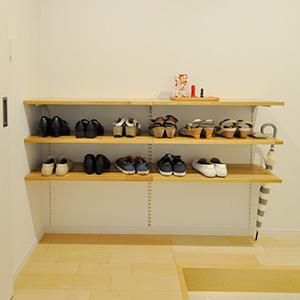 玄関は、傘を広げて干せるスペースを確保。造作のシューズラックは可動棚で高さ調節も自由自在。ベンチや手すりも設け、靴の脱ぎ履きや框の昇り降りも楽にできます。