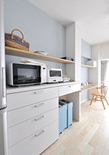 新しい住まいに求めたのは充分な収納量と、風が抜けるような間取り。玄関を入ってすぐのウォークスルークローゼットはその最たるもので、LDK側からも玄関側からも入れて便利。更衣室兼パントリーも2wayで使えるので、「あちこち回遊式になっていて動きやすい」とT様。どちらの部屋にも建具をつけているので、開け放てば風が抜け、閉めれば目隠しもでき、室温調整も可能な住まいになっています。