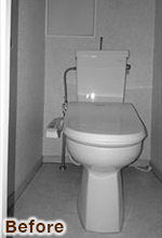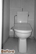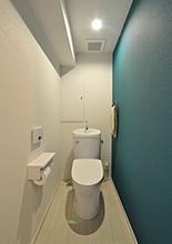 スペースを拡張してゆったり奥行きのあるトイレに。向かって右側の壁は落ちついた深緑のアクセントクロスをチョイス。便器は超節水で経済的なTOTO/ピュアレストEXに交換しています。