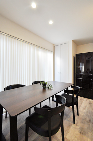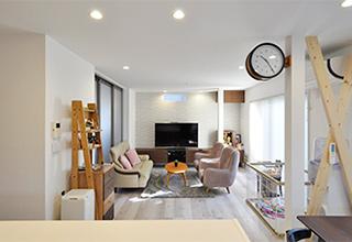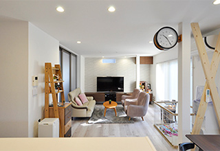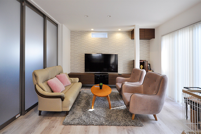 居間と和室をつなげて家族みんなが集まれる広々としたLDKに。ワンちゃんも一緒に過ごすリビングは、デザイン性と消臭・調湿性能を兼ねて、テレビ背面の壁にLIXIL/エコカラットを貼っています。二重サッシと床暖房も完備しているので冬でも温かく過ごせます。