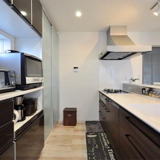 北側にあった壁付けキッチンは、南側に移動してコミュニケーションが取りやすい対面キッチンに。カウンター収納付きが気に入りTOTOのクラッソ(I-2574)を選択。大容量の背面収納は