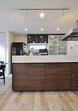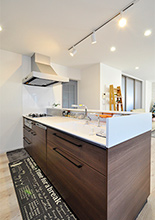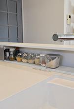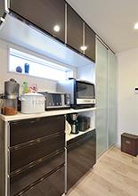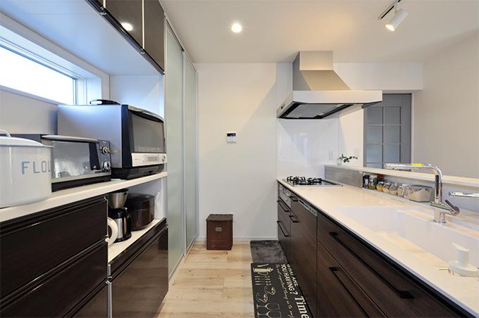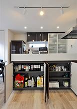 キッチンカウンターはリビング側が収納になっていて便利。作業台側には凹みの収納があるので、つい出しっぱなしになる調味料をしまっておくこともできます。背面収納の並びにはクローゼットを設置し、食料品のストックやホットプレートなどもスッキリ片付けられます。