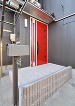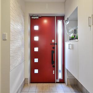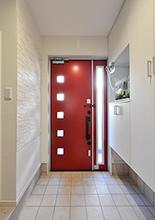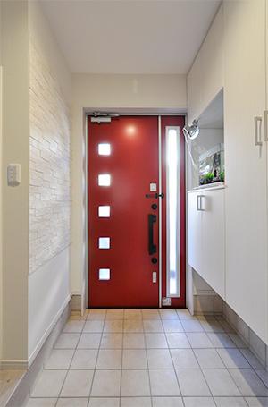 印象的なワインレッドの玄関ドアはLIXIL/ジエスタ。右には壁一面の玄関収納、向かいの壁は防水性が高くお手入れがしやすいエコカラットプラス(LIXIL)を貼りアクセントに。リビング引き戸はヴィンテージ感のあるブルー・グレーオークの建具(パナソニック/クラフトレーベルシリーズ)をセレクト。隣にはペットドアも新設。