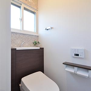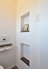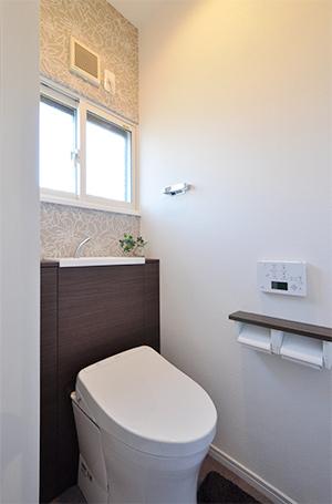 間口が広くなるように3枚引き戸に。便器は収納付きで見た目にもスッキリなTOTO/レストパル(I型)。背面の壁はアクセントクロスでおしゃれに。正面壁にはニッチ棚を造作しています。