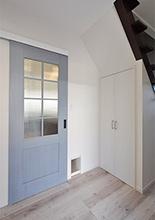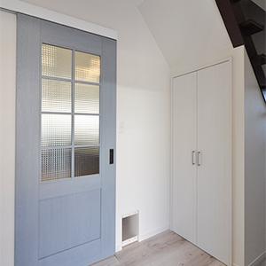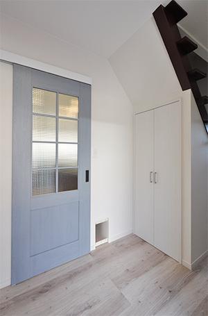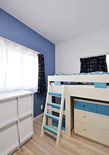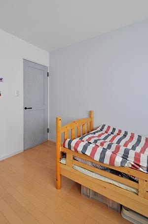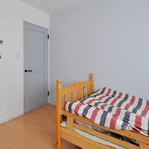各部屋、アクセントクロスで個性的な空間に。娘さんは淡いブルーをチョイスし可愛らしいお部屋に。息子さんは濃い目のブルーでかっこよく。シャビーテイストな建具はLIXIL/ラシッサDパレットシリーズ。