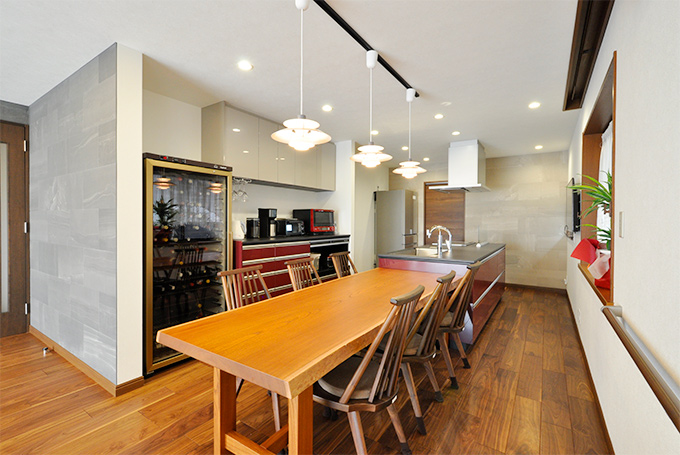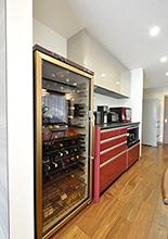 セミオープンのL型対面キッチンからアイランドキッチン(クリナップ/セントロ)に。スッキリしたIH調理器にワークトップはセラミックを採用。フラットなキッチンなので、ダイニングテーブルへの配膳や片づけもしやすいのが特徴です。背面収納(クリナップ/セントロ)も同じジャスパーレッドの扉色で統一。その並びには100本以上が貯蔵できる本格派のワインセラーを完備しています。